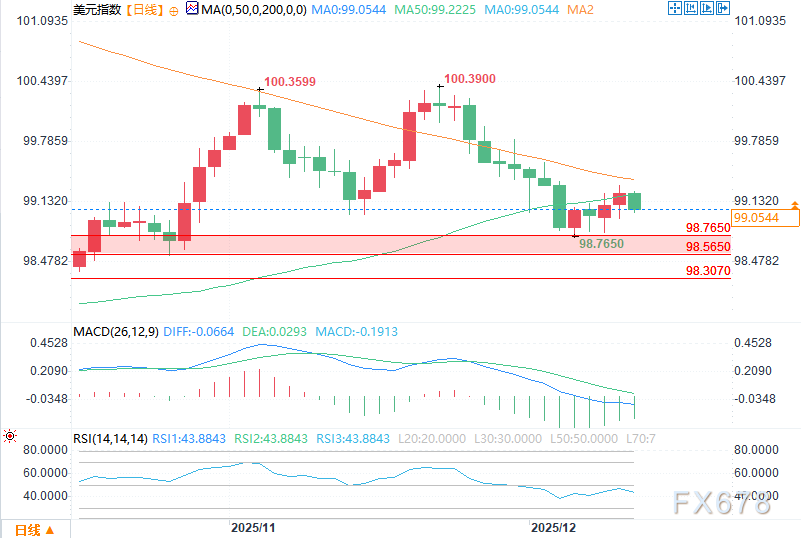 日线级别下,美元指数目前承压于50日均线(99.223)下方。若有效突破该位置,将进一步向200日均线(99.406)迈进,该点位被视为触发美元指数加速上行的关键信号。若未能突破50日均线,指数则可能下探98.765–98.565区间支撑,一旦跌破98.565,后续将进一步考验98.307–97.814支撑区域。